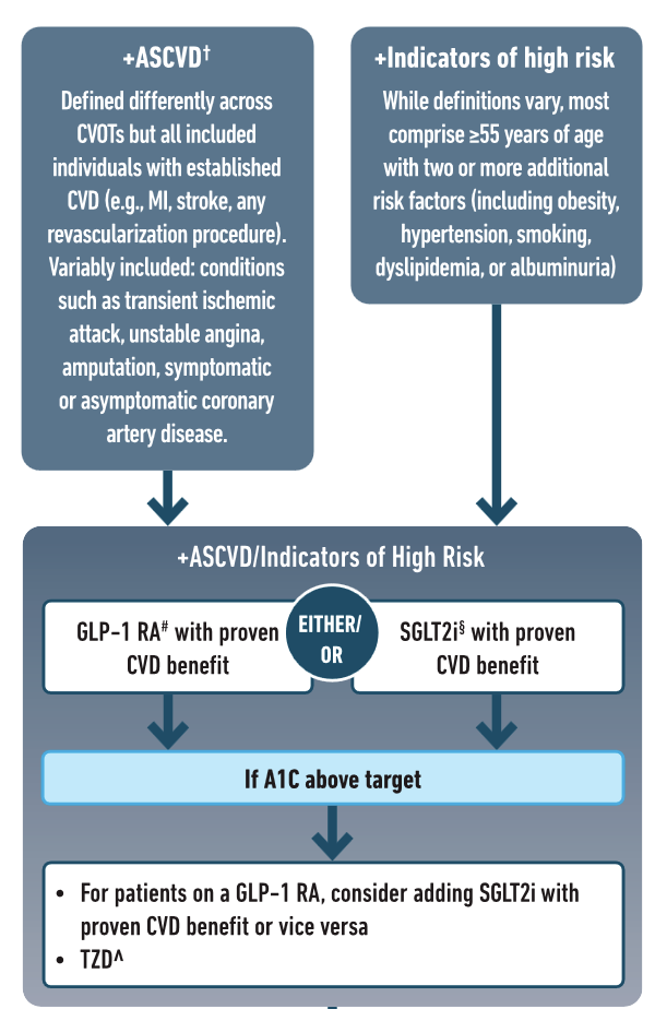 As the patient now has vascular disease, they would benefit from medications with proven benefit for secondary prevention of Major Adverse Cardiac Events. If readers are unfamiliar I really like the full diagram from page S166 of Part 9 (Pharmacologic Approaches to Glycemic Treatment) of the 2024 ADA guidelines. Wordy I know but the diagram itself is easy to read and I often refer primary care docs or residents to it if they need a handy guide. I’ve included an excerpt of the full chart here: